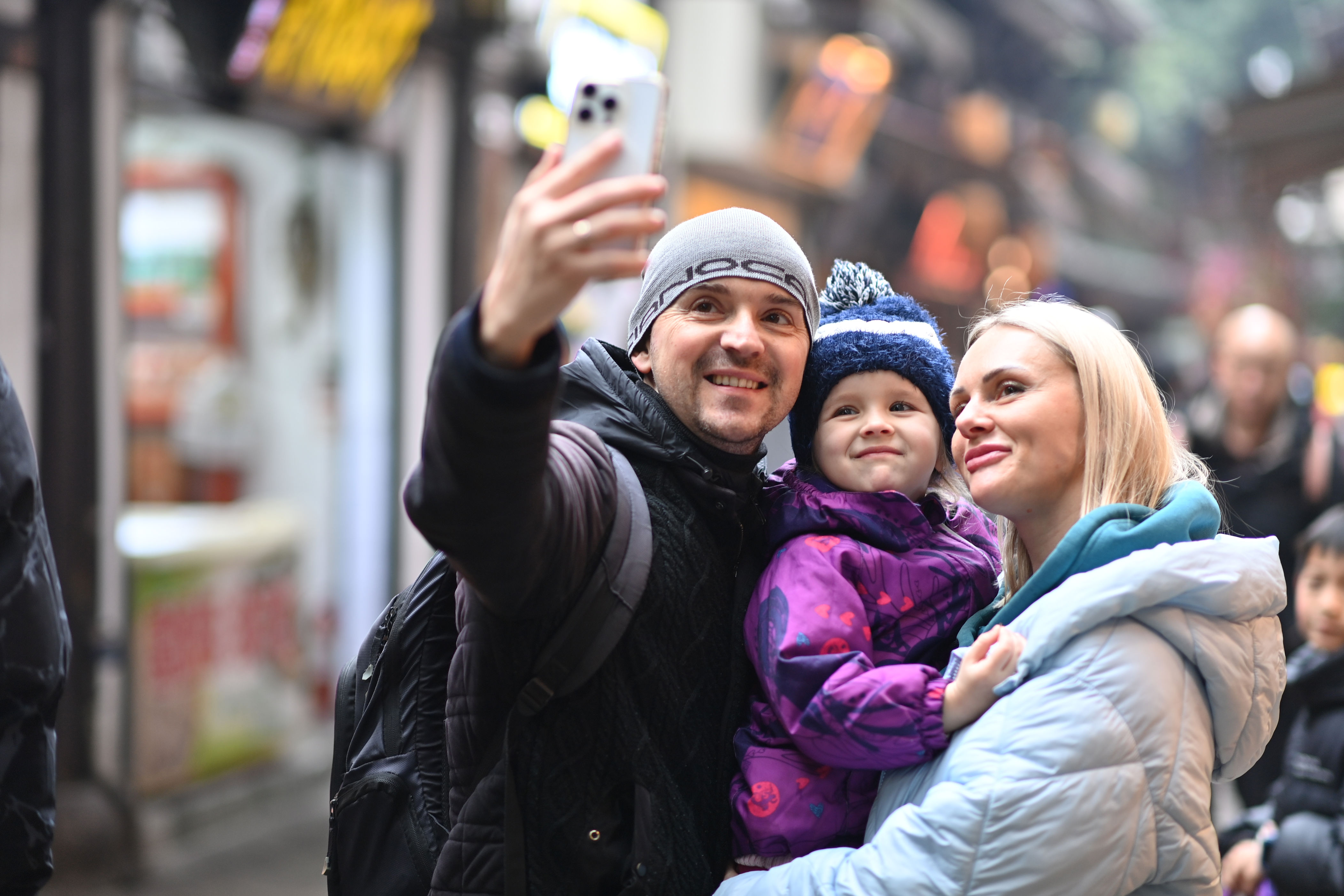 ▲2026年1月11日,沙坪坝区磁器口古镇,来自俄罗斯的旅客正在拍照打卡。特约照相 孙凯芳