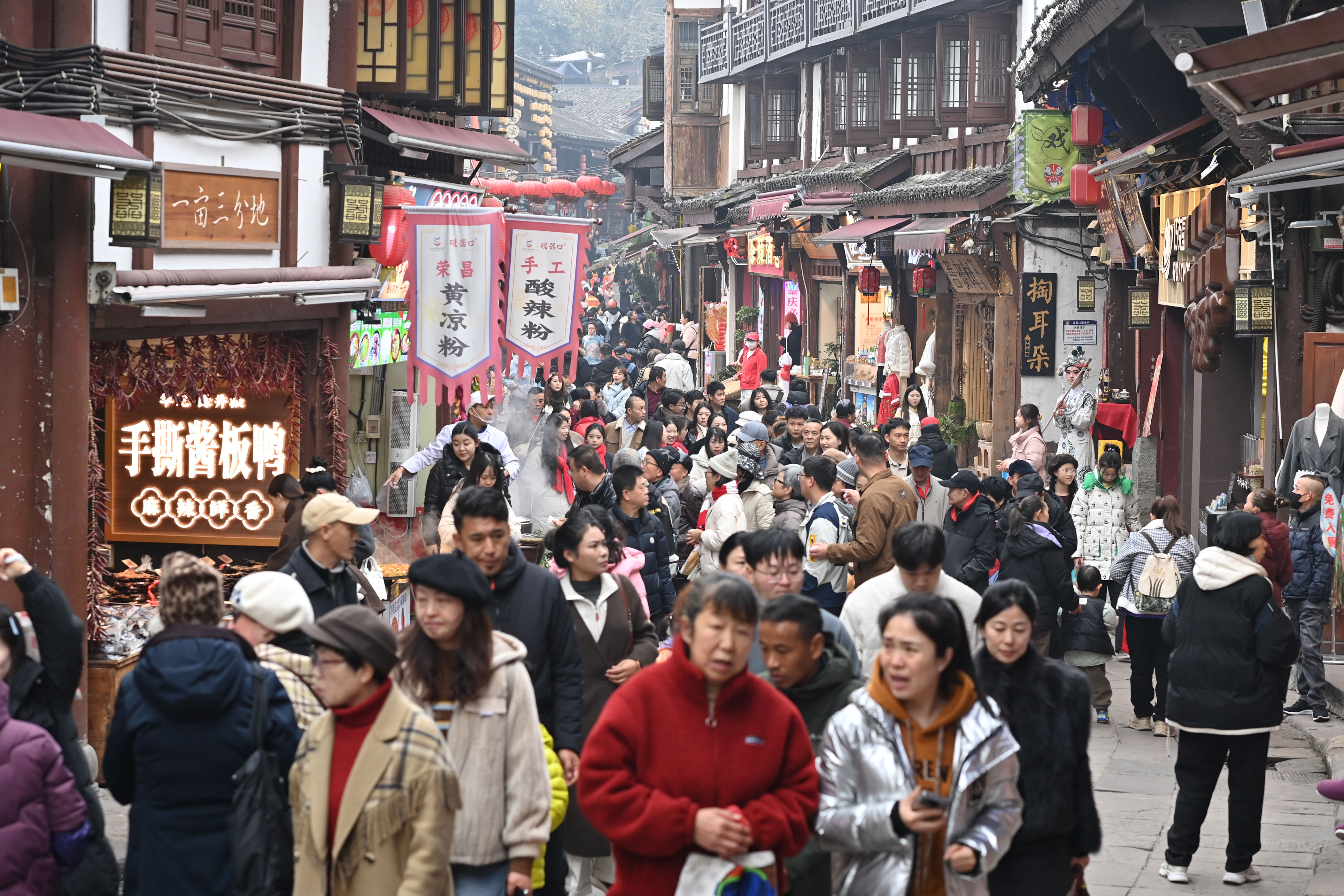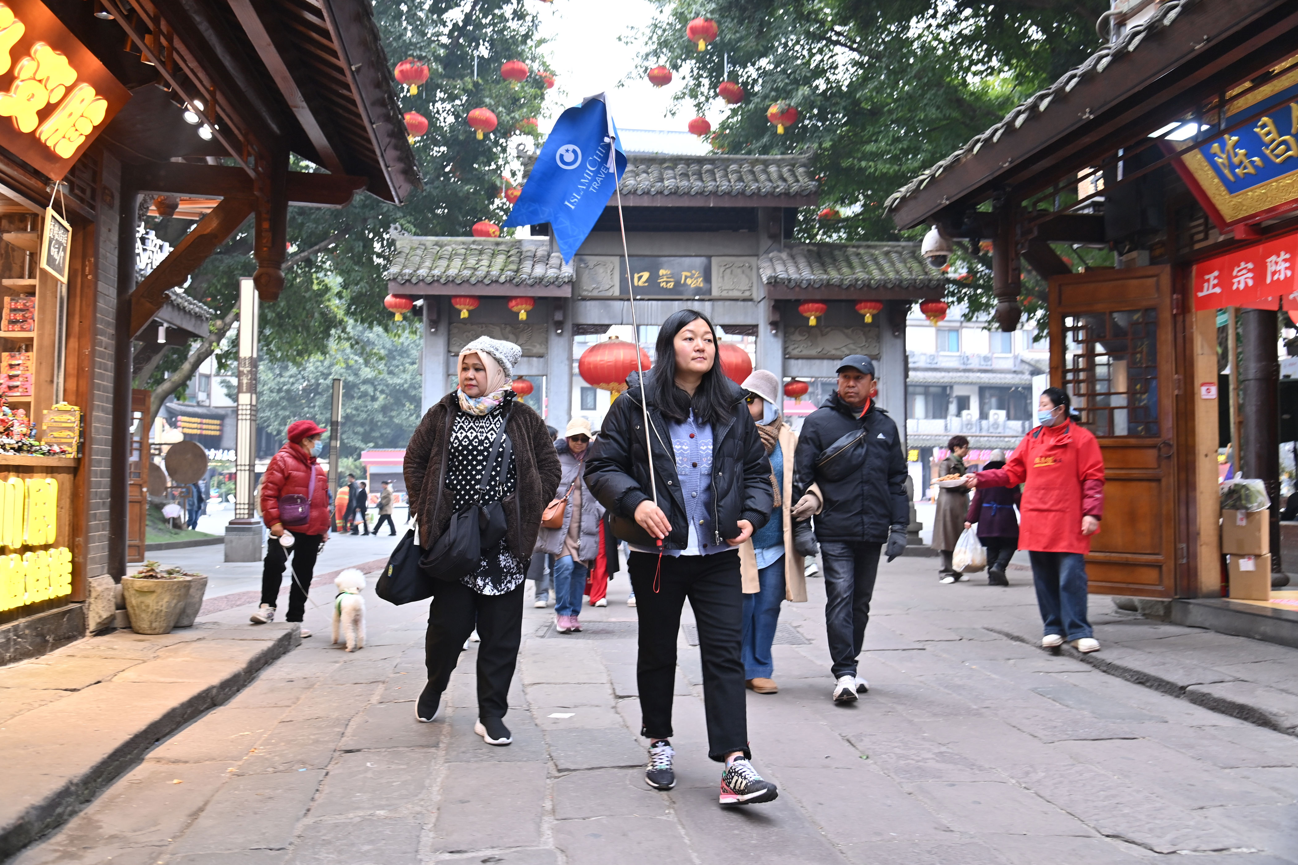 ▲1月11日,沙坪坝区磁器口古镇,来自马来西亚旅行团的旅客正在游玩。