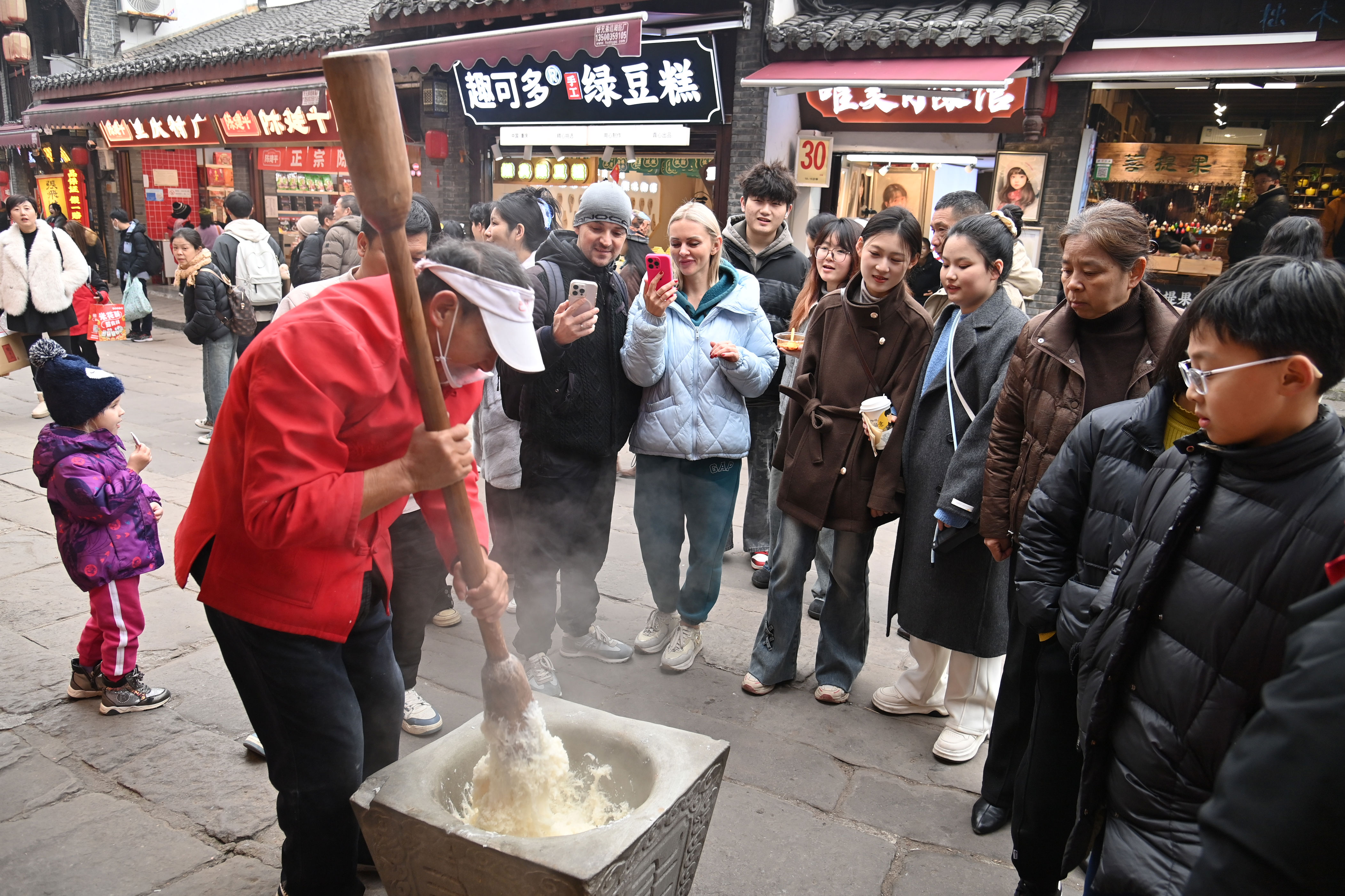 ▲1月11日尊龙体育网,沙坪坝区磁器口古镇,中外旅客在不雅看当地秉性好意思食的制作经由。
