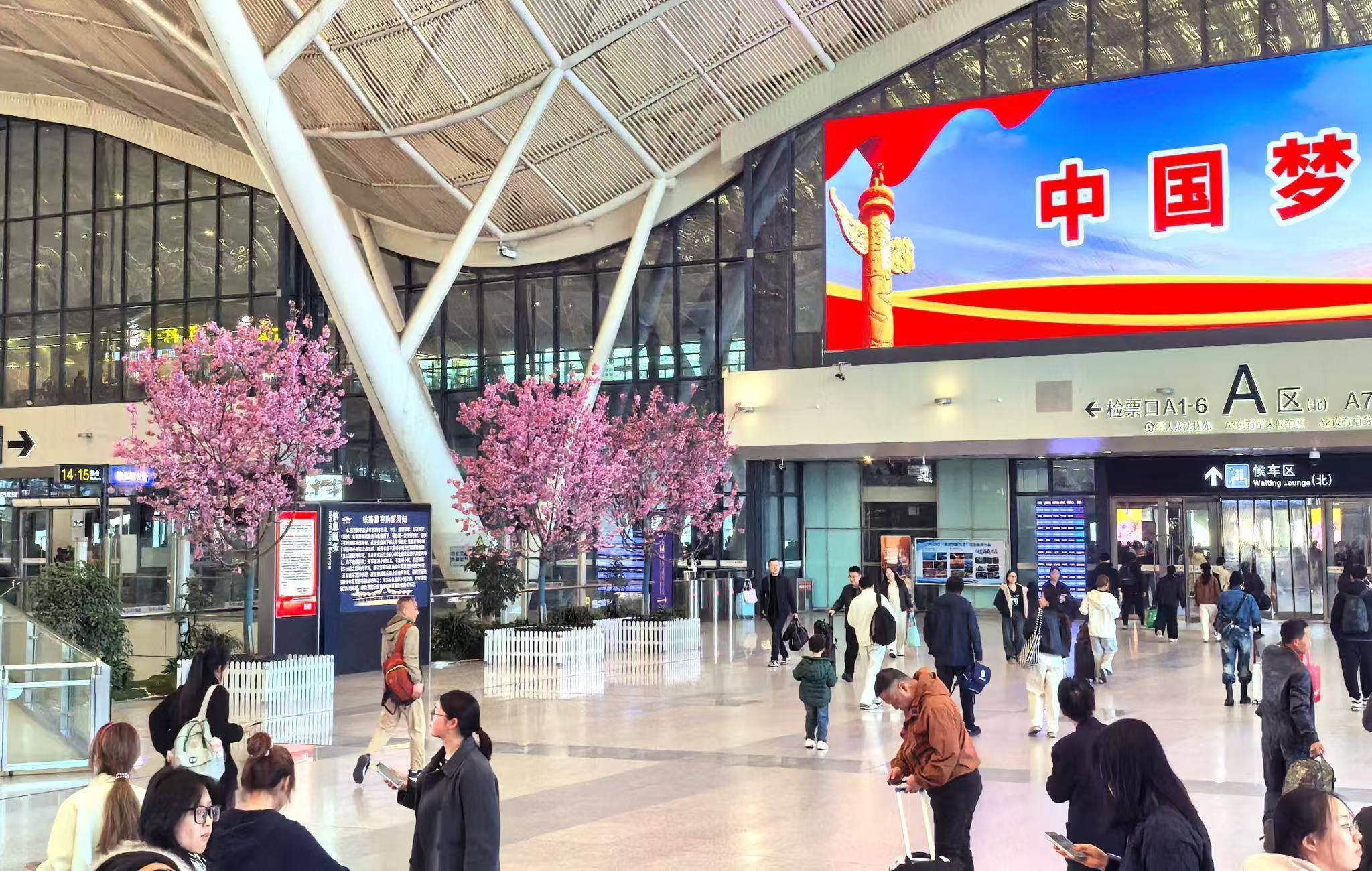 3月13日,武汉站东西进站口、候车区等地迎来一批荒芜“宾客”——20棵约3米高的真樱花树被搬进高铁站,粉色小花缀满枝端,引得来往搭客纷繁安身拍照。