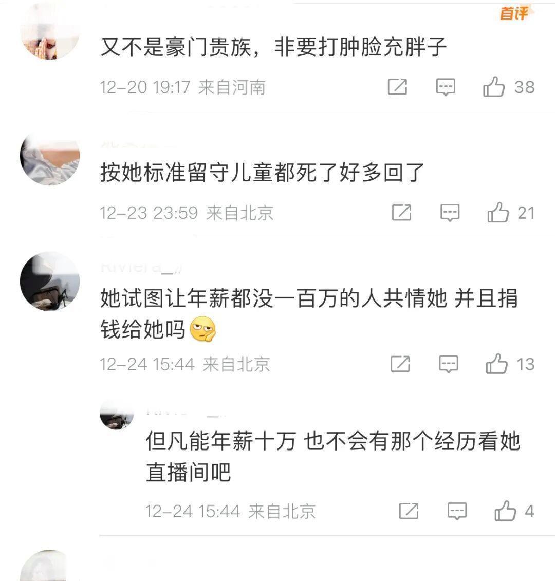 “又不是朱门贵族,非要打肿脸充胖子”“按她的步伐留守儿童皆死了好多回了”“她试图让年薪皆莫得100万的东说念主共情她,况且给她捐款吗?”