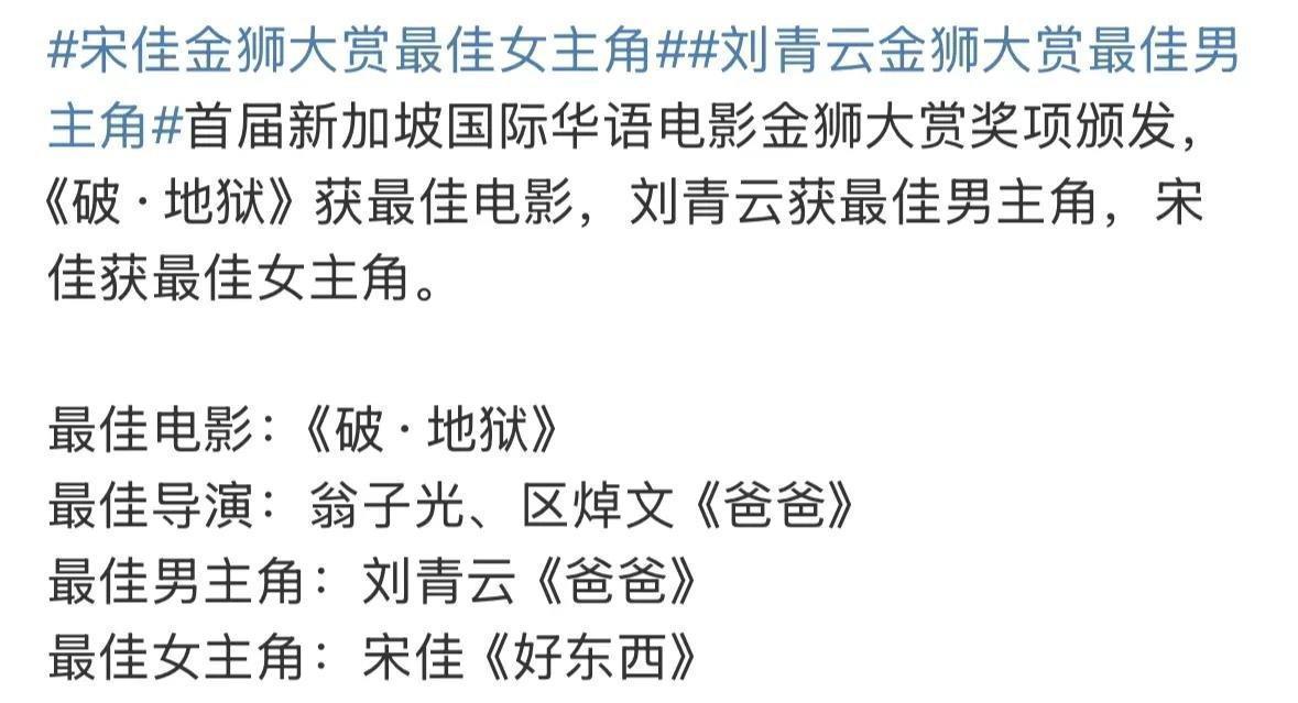 此次最好女主角的奖项她给了宋佳,而最好女破裂则颁给了钟楚曦。