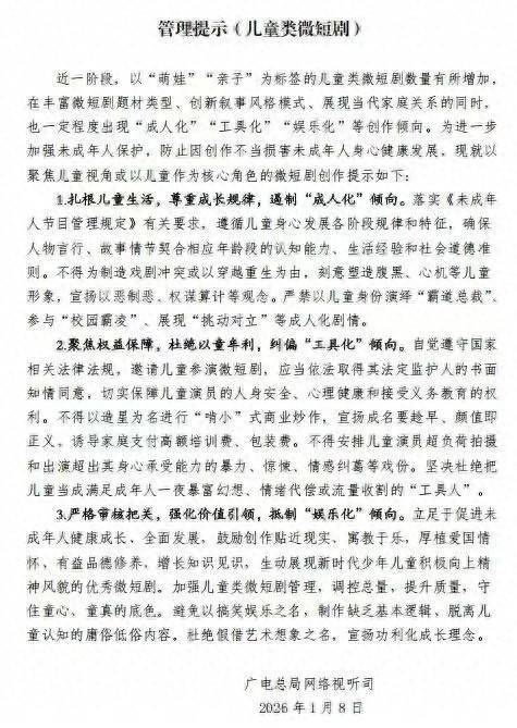 1月8日,广电总局聚积视听司发布儿童类微短剧措置辅导。辅导指出,近一阶段尊龙凯时(中国)官方网站,以“萌娃”“亲子”为标签的儿童类微短剧数目有所加多,在丰富微短剧题材类型、翻新叙事格调花样、展现现代家庭关系的同期,也一定进度出现“成东谈主化”“用具化”“文娱化”等创作倾向。为进一步加强未成年东谈主保护,防患因创作不当挫伤未成年东谈主身心健康发展,现就以聚焦儿童视角或以儿童动作中枢变装的微短剧创作。辅导如下: