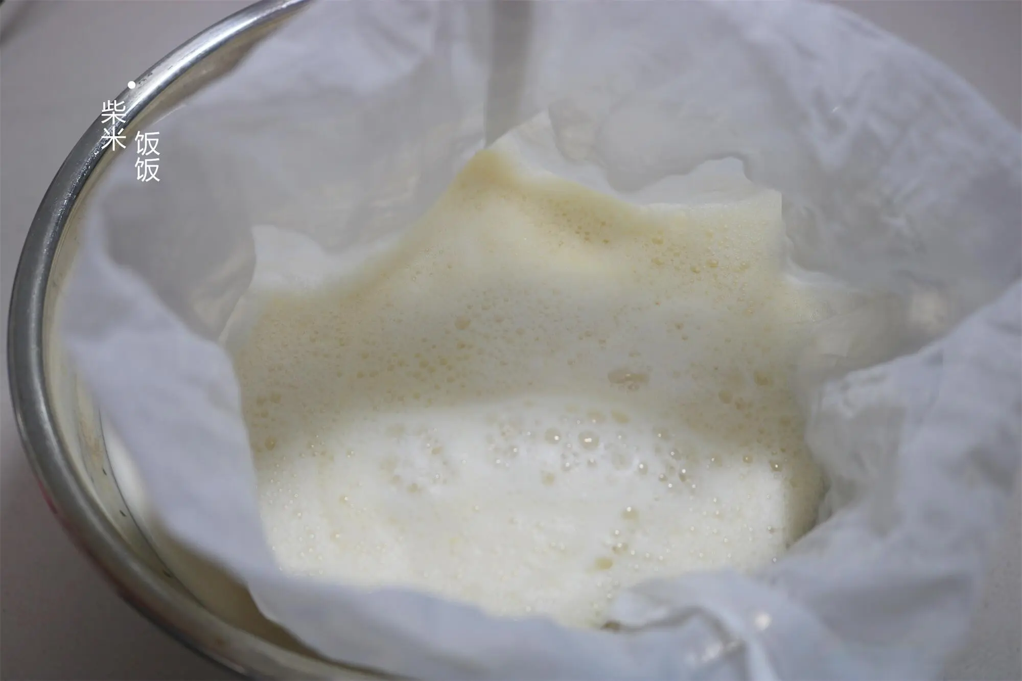 4,倒进过滤袋里,把豆乳挤出来,豆渣过滤掉。