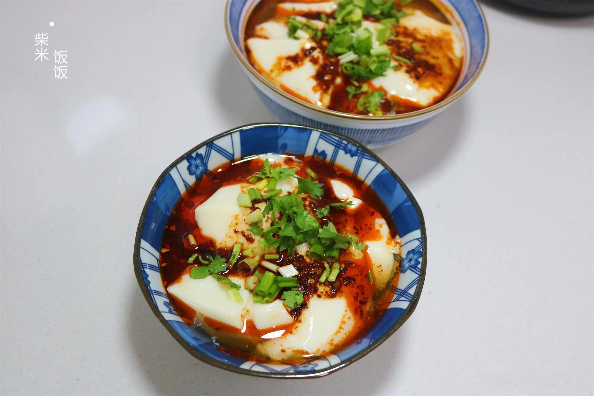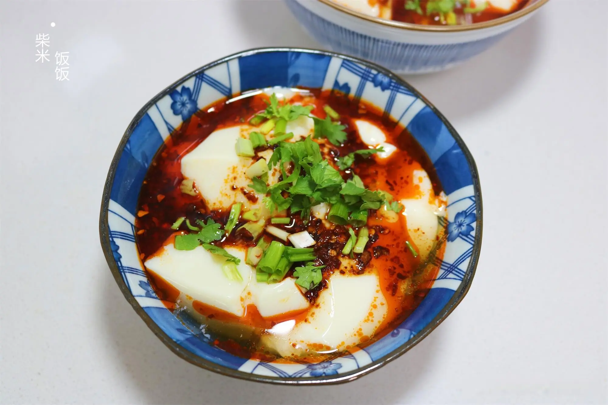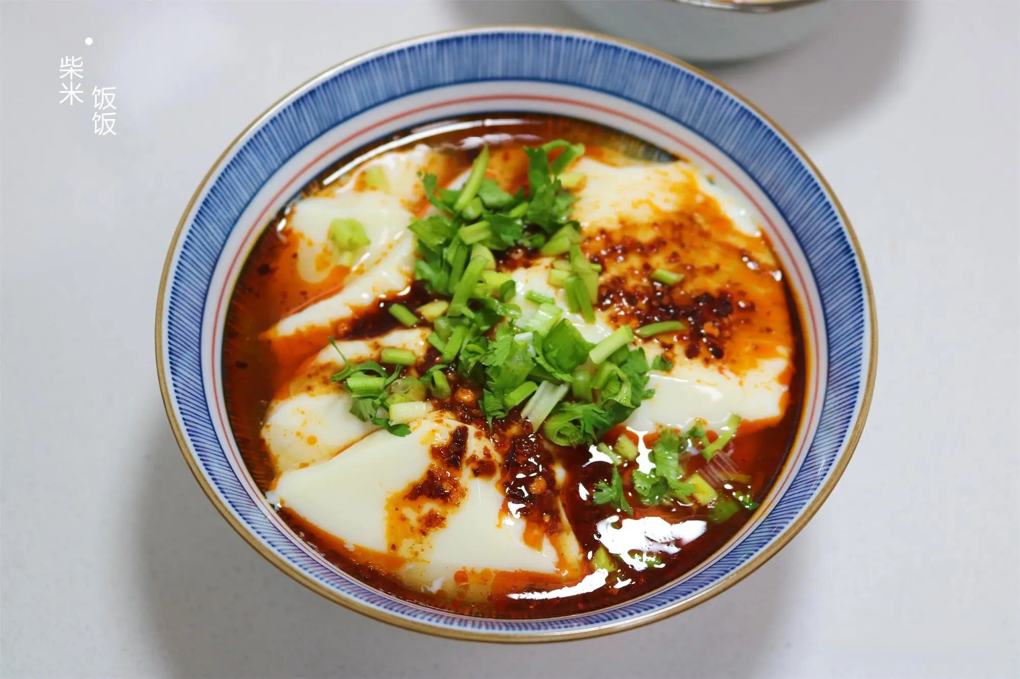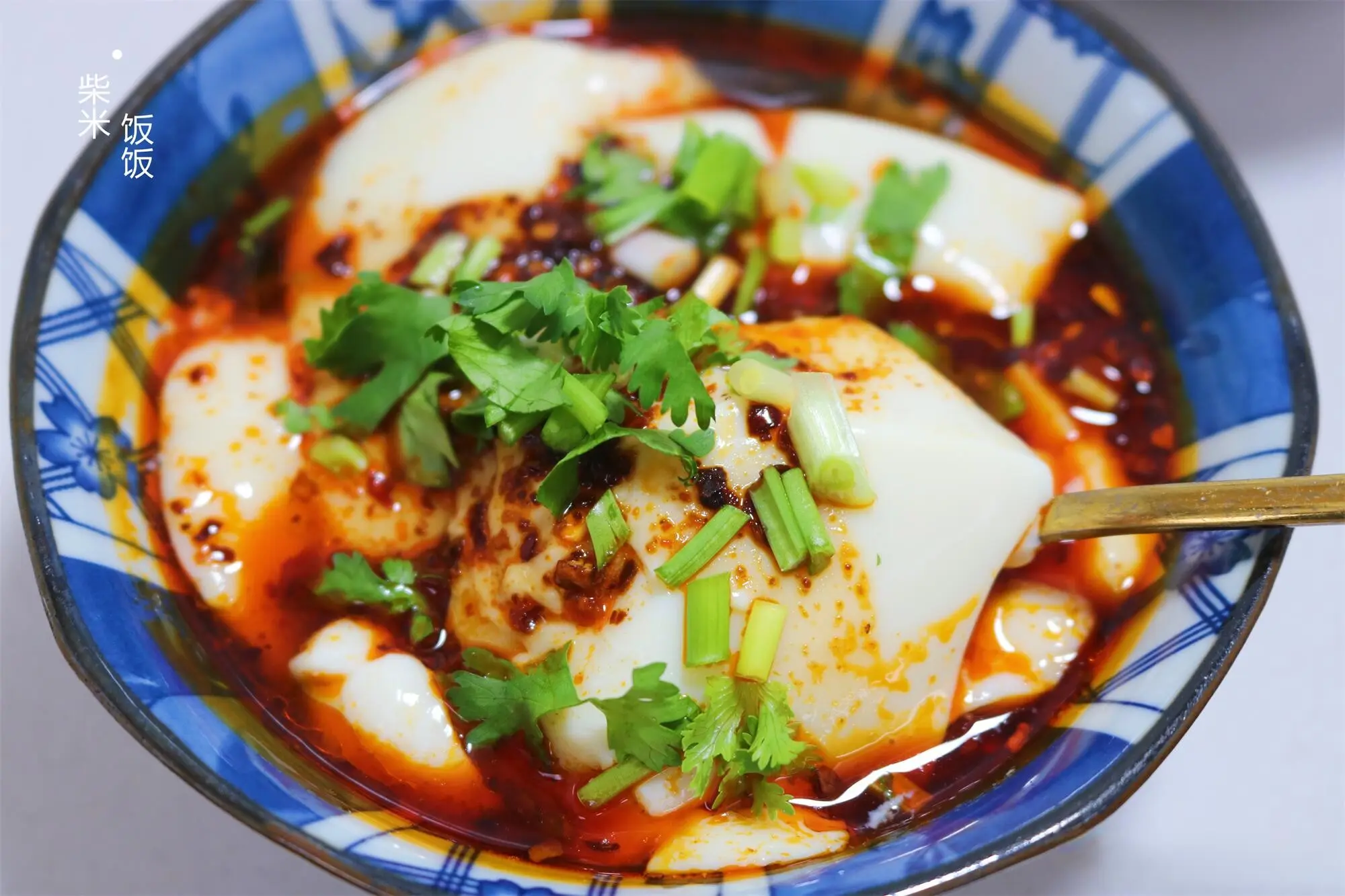 11,把豆腐脑盛到碗里,放上2勺调好的料汁,再撒点香葱香菜就可以吃了。鲜香嫩滑,吃起来很开胃。