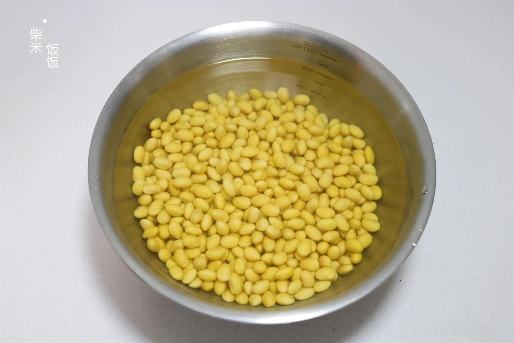1,150克黄豆凉水浸泡至少6个小时,我这里是浸泡了一个晚上。当今天气热了,最佳放雪柜冷藏浸泡。