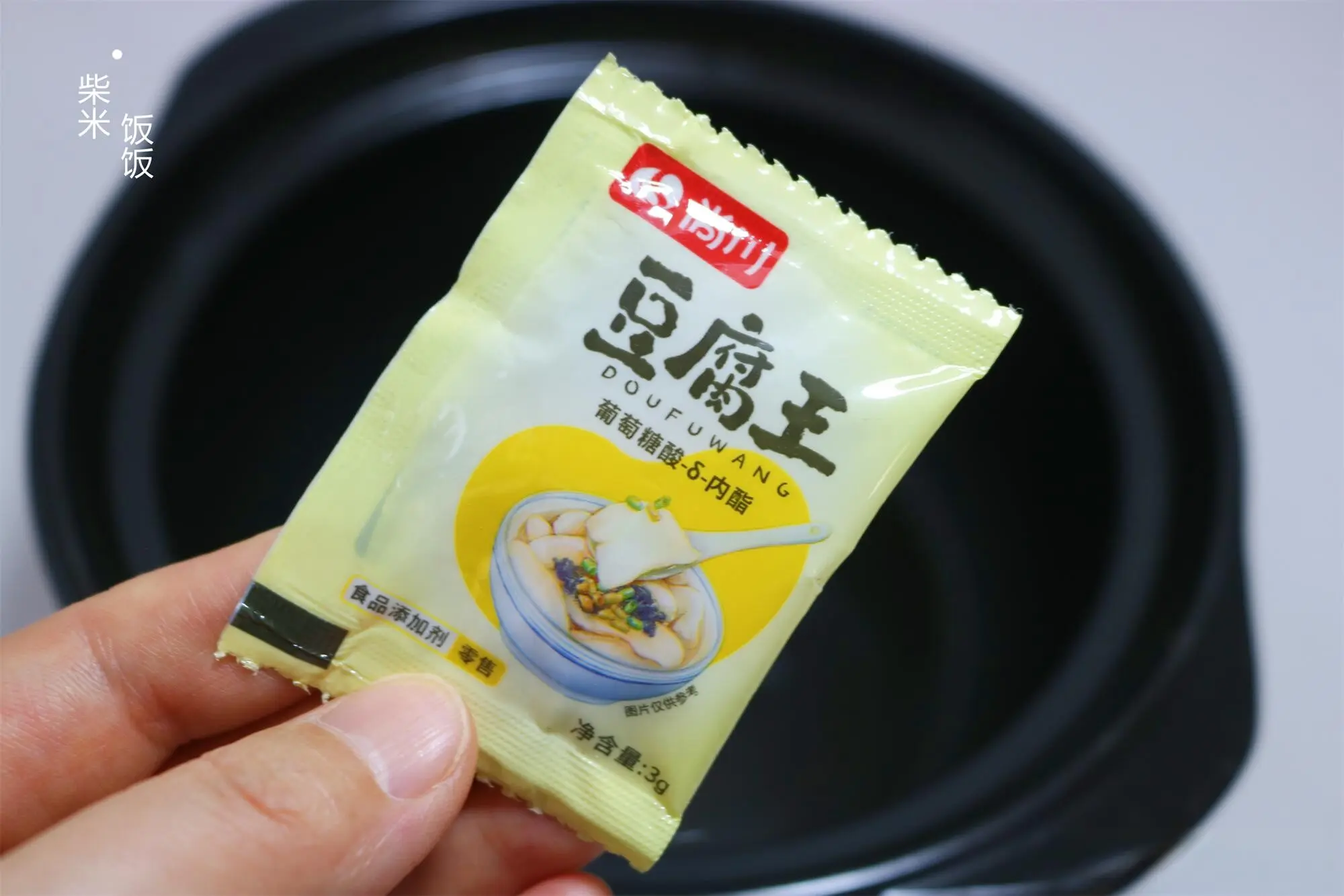 6,一包豆腐王内酯(3克),倒进一个大点的容器里。加少量温滚水搅拌化开。
